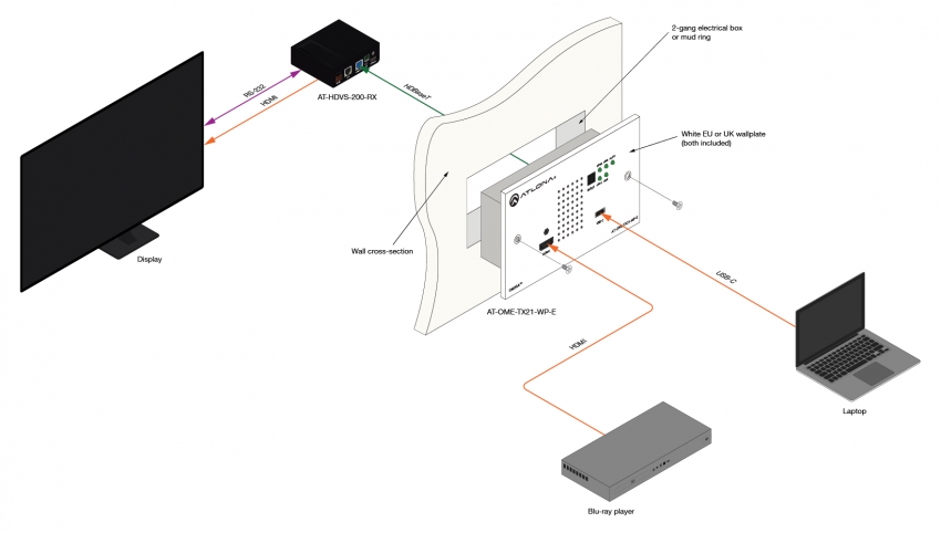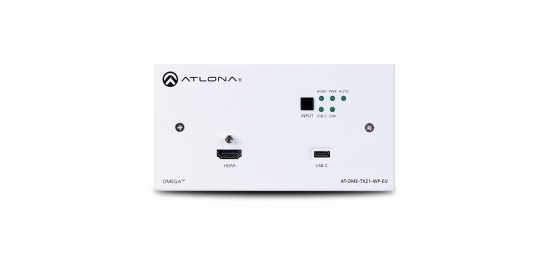 The Atlona AT-OME-TX21-WP-E is a 2ࡧ switcher and HDBaseT transmitter with HDMI and USB-C inputs. It is designed for commercial installations in Europe. The OME-TX21-WP-E includes interchangeable EU and UK faceplates and brackets, with white faceplates for each version. The USB-C input is ideal for AV interfacing with Mac®, Chromebook™, and Windows®PCs, as well as smartphones and tablets. Video signals up to 4K/UHD @ 60 Hz with 4:2:0 chroma subsampling, plus embedded audio and control can be transmitted up to 330 feet (100 meters). The OME-TX21-WP-E is HDCP 2.2 compliant. It is designed for use with Omega™ Series receivers and switchers, select HDVS Series receivers, the AT-UHD-EX-100CE-RX-PSE receiver, and other Atlona switchers with HDBaseT inputs. This transmitter can serve as an integral component of a fully automated AV system, with the convenience of automatic input selection and display control. It is remotely powered by Atlona HDBaseT-equipped devices through Power over Ethernet (PoE).