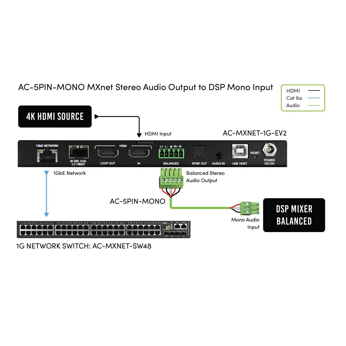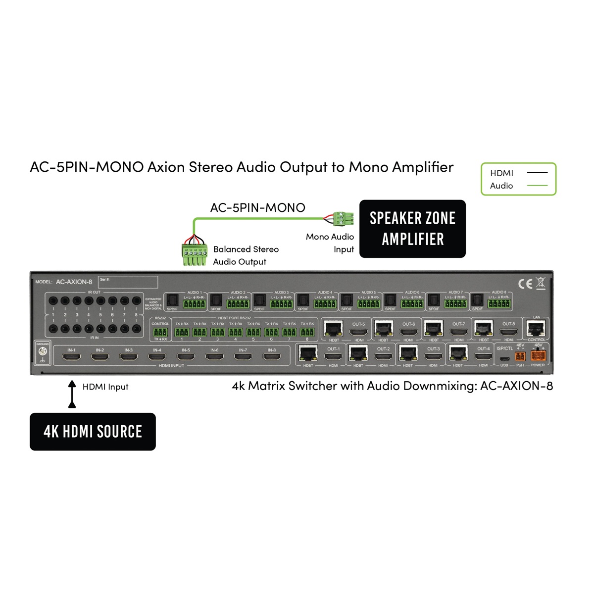 AC-5PIN-MONO är en balanserad stereo (2CH) till balanserad mono (1CH) adapter, bestående av en 5-polig Phoenix till 3-polig Phoenix mono summeringskrets. Gör det möjligt för integratörer att enkelt hantera och ansluta AVPro Edge-enheter till enkanalsförstärkare och digitala signalprocessorer.