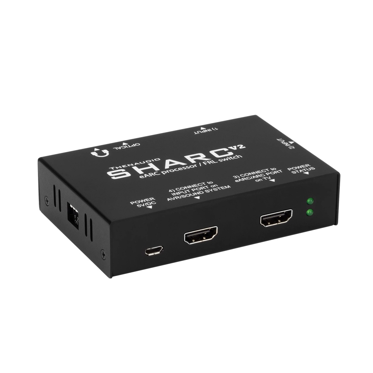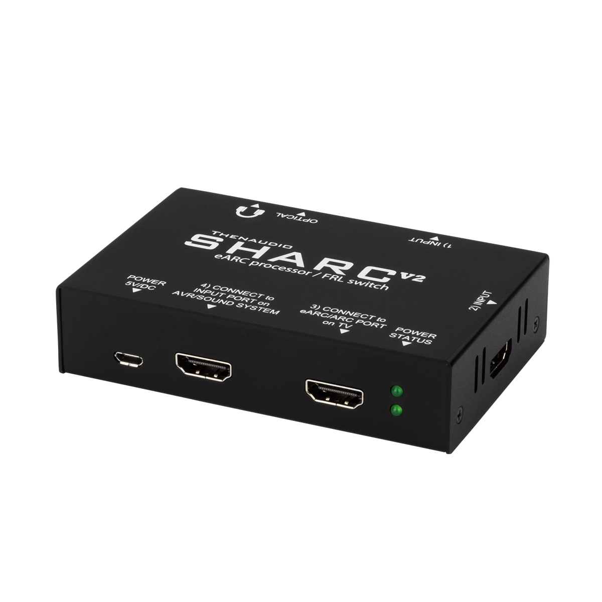 SHARC-V2 är en THENAUDIO eARC tvåzonsljudprocessor som lägger till en brusfri, högkvalitativ DAC för högt dynamiskt omfång via en 3,5 mm analog utgång som konverterar samplingsfrekvenser upp till 384 kHz. SHARC-V2 fungerar också som en avancerad HDMI 2.1, 8K, 48 Gbps (FRL 6) CEC-styrd A/V-omkopplare genom sin inbyggda version av en begränsad THENAUDIO GUIDE-omkopplare. (Obs: Ljud extraheras och förblir i sin digitala flerkanaliga codec-form; det nedmixas INTE eller konverteras till analog stereo för distribuerad flerzonsanvändning. För analog utgång måste källan ha sitt ursprung som tvåkanalig PCM). Videoinnehåll passerar oförändrat och avkodas inte.