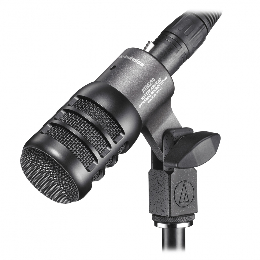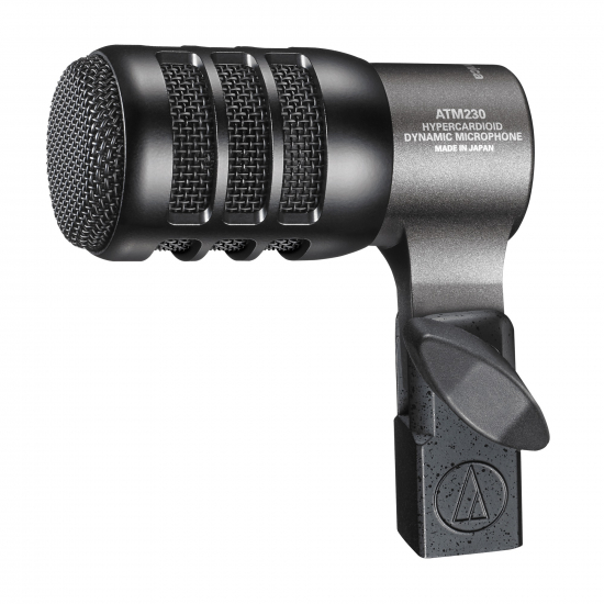 The compact ATM230 Artist Series instrument microphone is specially designed for use with drums. The mic’s proprietary capsule excels in high SPL applications, delivering full, well-rounded audio with an exceptional low-end. The hypercardioid polar pattern keeps the focus on the sound source, directionality that is aided by the mic’s low-profile design, which allows it to be placed in a wide variety of setups. All this makes the ATM230 ideally suited for miking toms, snare and other percussion instruments.