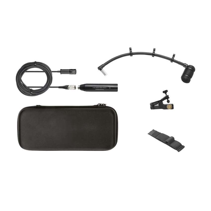 When teamed with the included AT8491U universal clip-on mount and strong, flexible AT8490L 9" gooseneck, the mic can be clipped securely to the bell of your instrument and positioned to stay where you want it – the gooseneck won’t flop around no matter how aggressively you move the instrument as you play. The microphone’s cardioid polar pattern isolates the instrument by reducing side and rear pickup, and the switchable 80 Hz high-pass filter on the in-line power module helps control undesired low-frequency noise. The system also includes an AT8468 violin mount with hook-and-loop fastener and a protective carrying case.