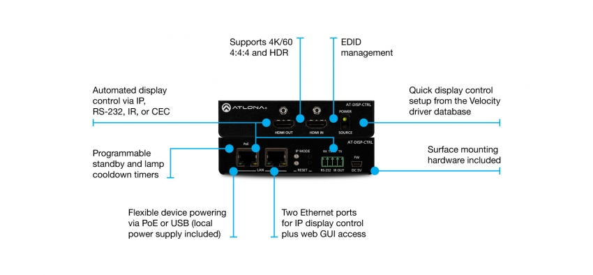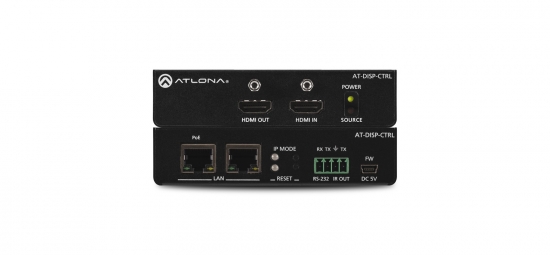The Atlona AT-DISP-CTRL is a compact display controller, designed for small meeting spaces and huddle rooms. The DISP-CTRL detects connection of a source device with an active signal, and then automatically sends a control command to power up a display. Similarly, when the device is disconnected, the DISP-CTRL delivers a command to power down the display. The DISP-CTRL can be configured to deliver pre-stored or user-programmed display control commands through TCP/IP, RS-232, IR, or CEC. Additionally, this controller includes EDID and HDCP management features, and can be powered locally or through Power over Ethernet (PoE). The DISP-CTRL is HDCP 2.2 compliant and supports 4K/UHD video @ 60 Hz with 4:4:4 chroma sampling, as well as HDMI data rates up to 18 Gbps.