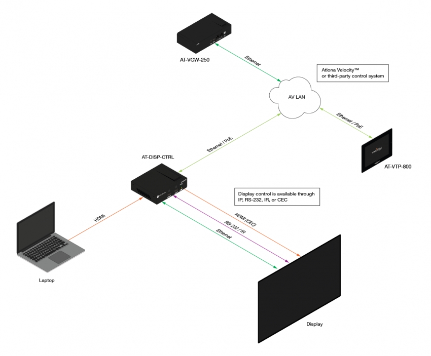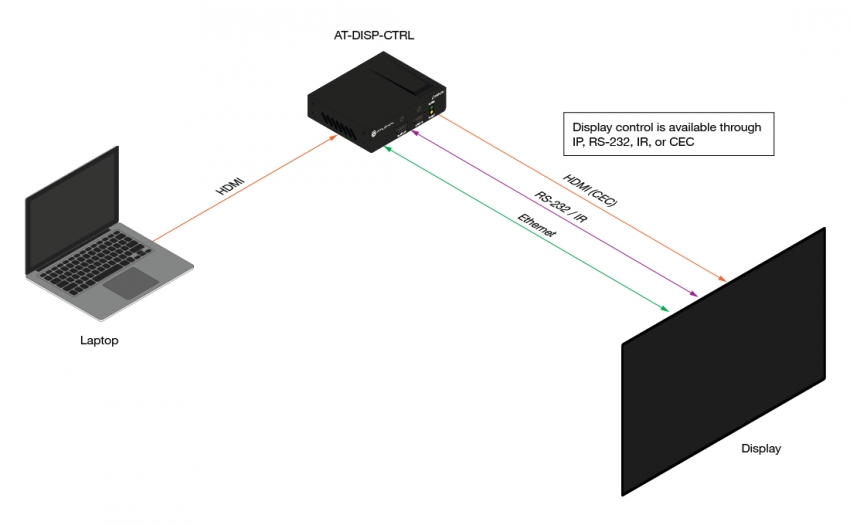 The DISP-CTRL enables simple plug-and-play operation for a presenter – while eliminating the need to rely on a handheld remote control that is often misplaced or non-functional (dead batteries). The DISP-CTRL can be used on its own, or in conjunction with an HDMI switcher such as the JunoX™ 451 (AT-JUNO-451). The AT-IR-CS-TX emitter cable is available for controlling a display through IR. For additional integration convenience, the DISP-CTRL features adjustable standby and lamp cooldown timer modes, TCP/IP and RS-232 control, and remote management with Atlona Management System (AMS). A comprehensive selection of display drivers from the Velocity™ Control System driver database is available for setting IR, RS-232, or IP control commands.