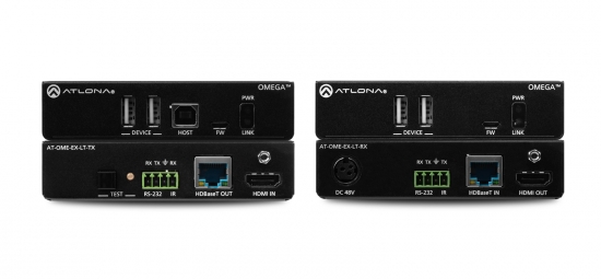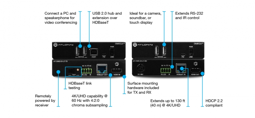 The Atlona AT-OME-EX-KIT-LT is an HDBaseT extender for video up to 4K/60 4:2:0, plus embedded audio, control, and USB over distances up to 130 feet (40 meters) for 4K/UHD, and up to 230 feet (70 meters) for 1080p/60 video. Part of the Omega™ Series of integration products for modern AV communications and collaboration, the OME-EX-KIT-LT is HDCP 2.2 compliant and extends IR and RS-232 control signals. The integrated USB extension addresses the challenge of connecting between USB devices at remote locations, and is ideal for software video conferencing and touch or interactive displays. The transmitter includes a USB 2.0 host interface for a PC, plus two peripheral devices such as a speakerphone, microphone, or keyboard and mouse. The receiver provides two USB interfaces for devices such as a camera, soundbar, or display.