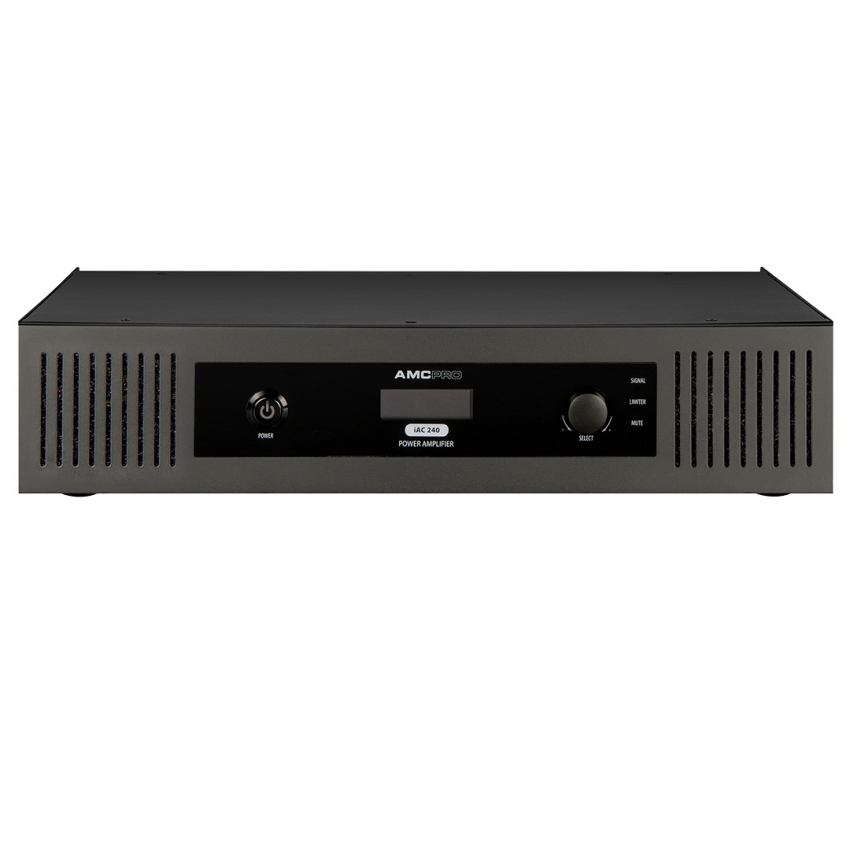 Single-channel Class-D amplifier with 240 W power output. Created for 100 V and low impedance high-quality background music systems. Containing Balanced Phoenix & Stereo RCA input and audio link output connectors. Amplifiers have an RS232 control port for integration amplifiers with third-party automation systems that allow using iAC amplifiers in large and complex audio systems that can be automated and controlled remotely. Due to the integrated signal processor, amplifier‘s volume level, tone control, mute, and standby status can be controlled with a rotary selector as well as by RS232 protocol.