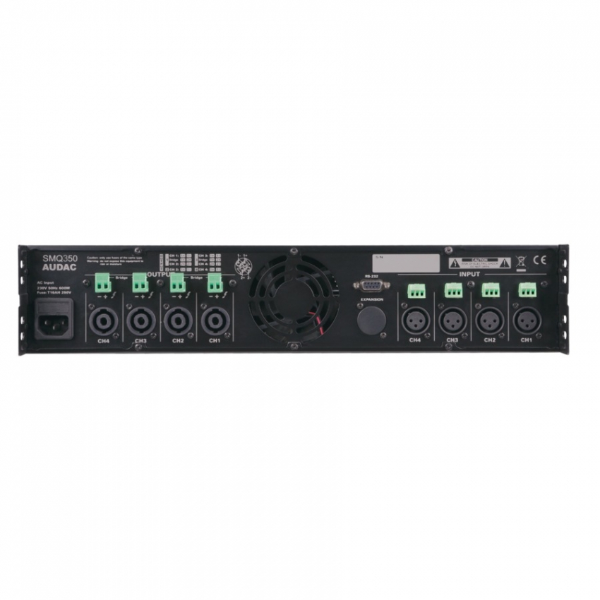 Audac SMQ350 är ett 4-kanals-steg för lågohm. Steget är försedd med en WaveDynamics™ DSP-processor, vilket ger bl.a. aktiv delning, 7-bands EQ, limiter, bass-boost, delay m.m. Plint / XLR in och alla utgångar har plintanslutning samt Speakon.