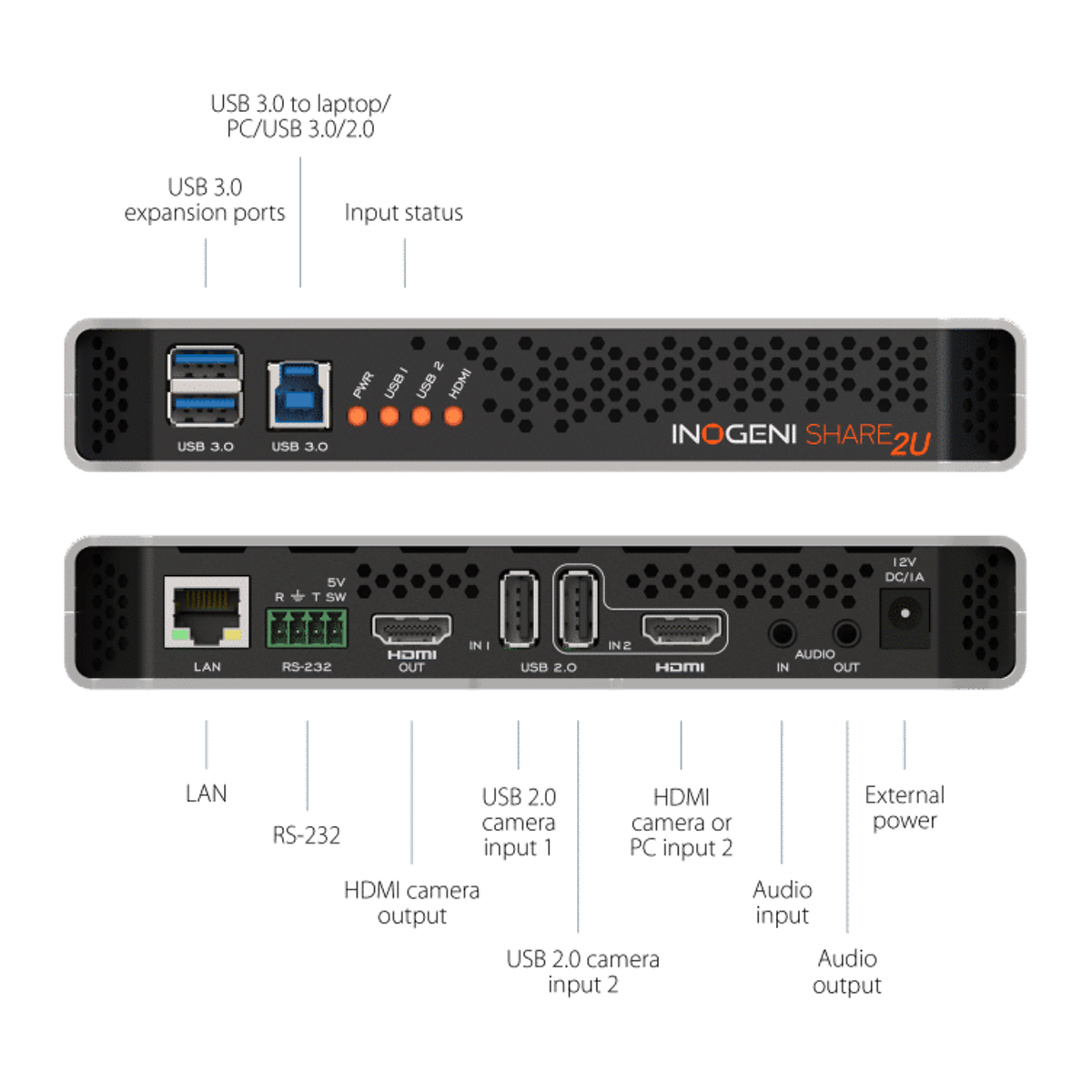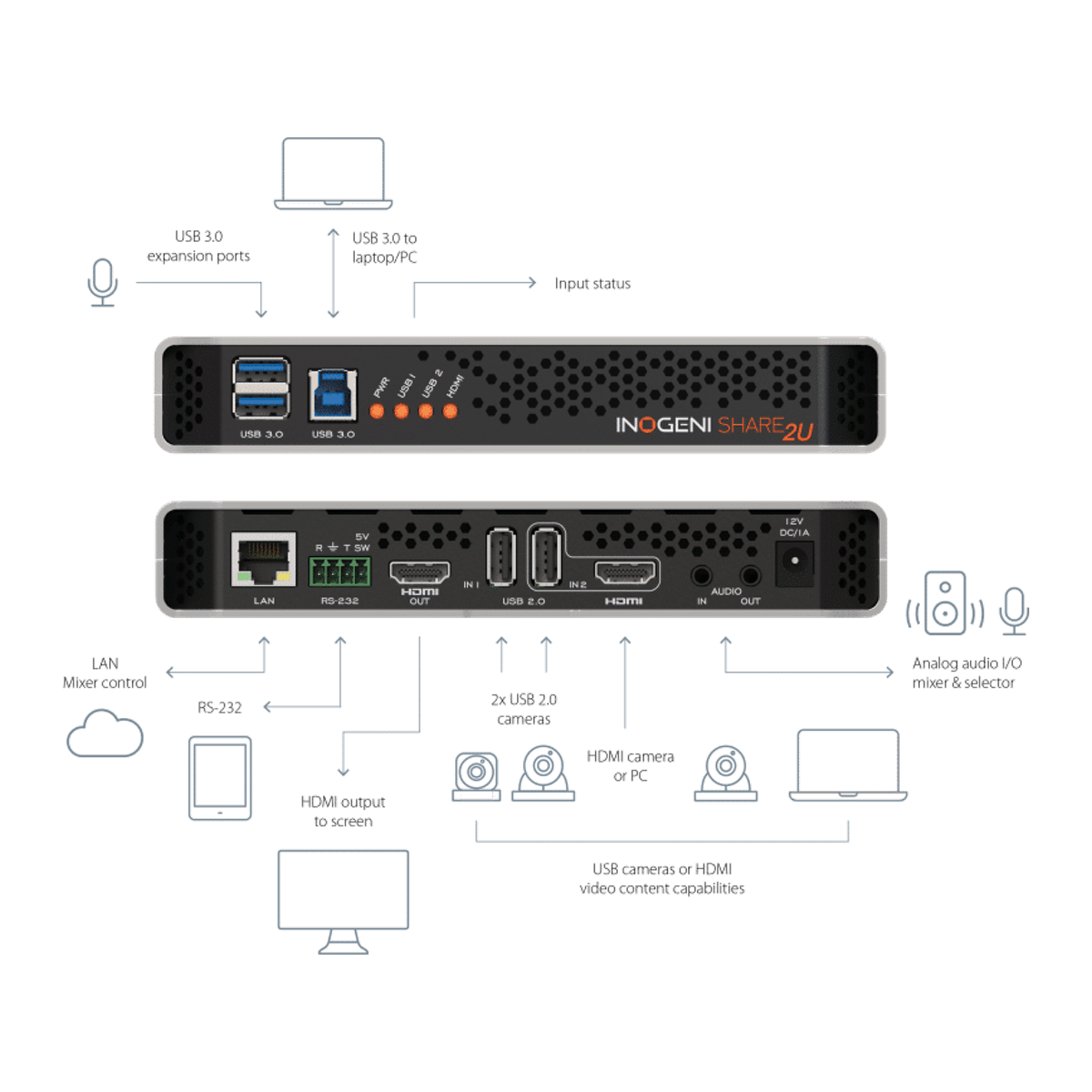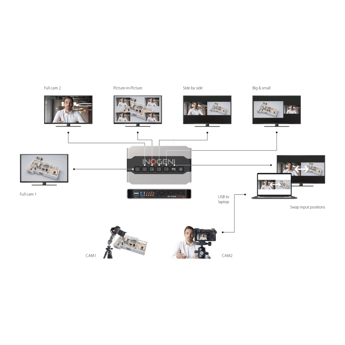 INOGENI SHARE2U är en professionell Plug-and-Go videomixer som gör det möjligt att kombinera två kamerakällor i Picture-in-Picture eller side-by-side till en enda videoström. Den är utvecklad för moderna HyFlex-klassrum, samarbetsrum, webbinarier och livestreaming där enkelhet, flexibilitet och hög kompatibilitet är avgörande.